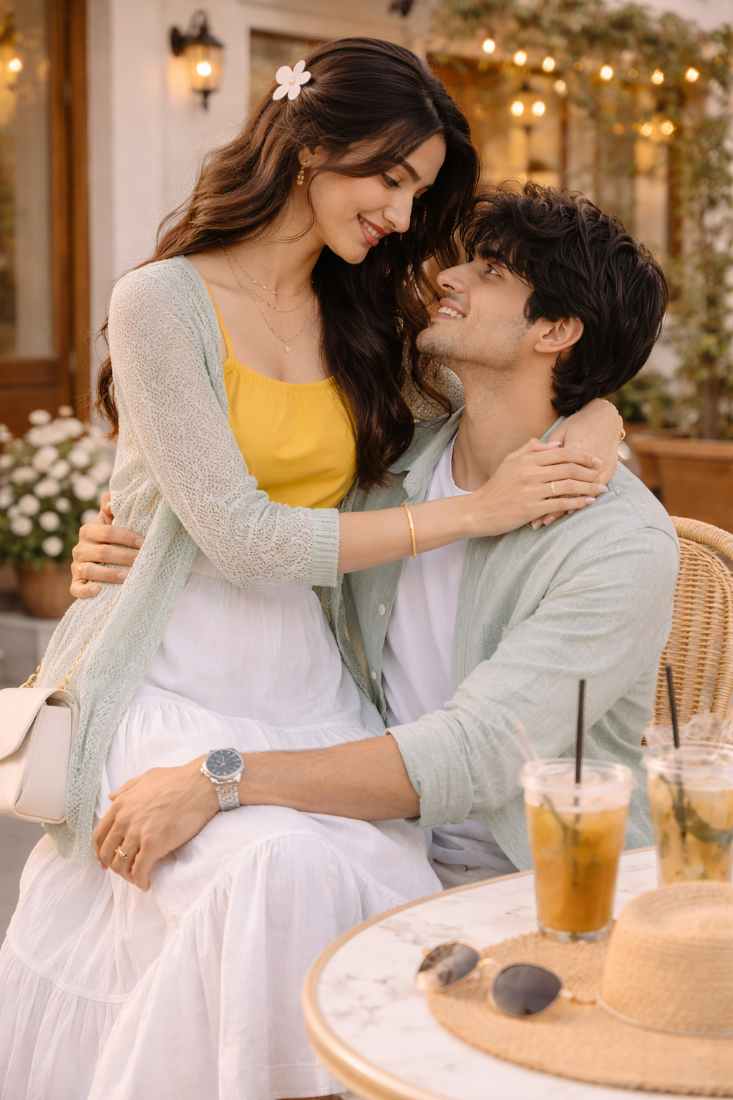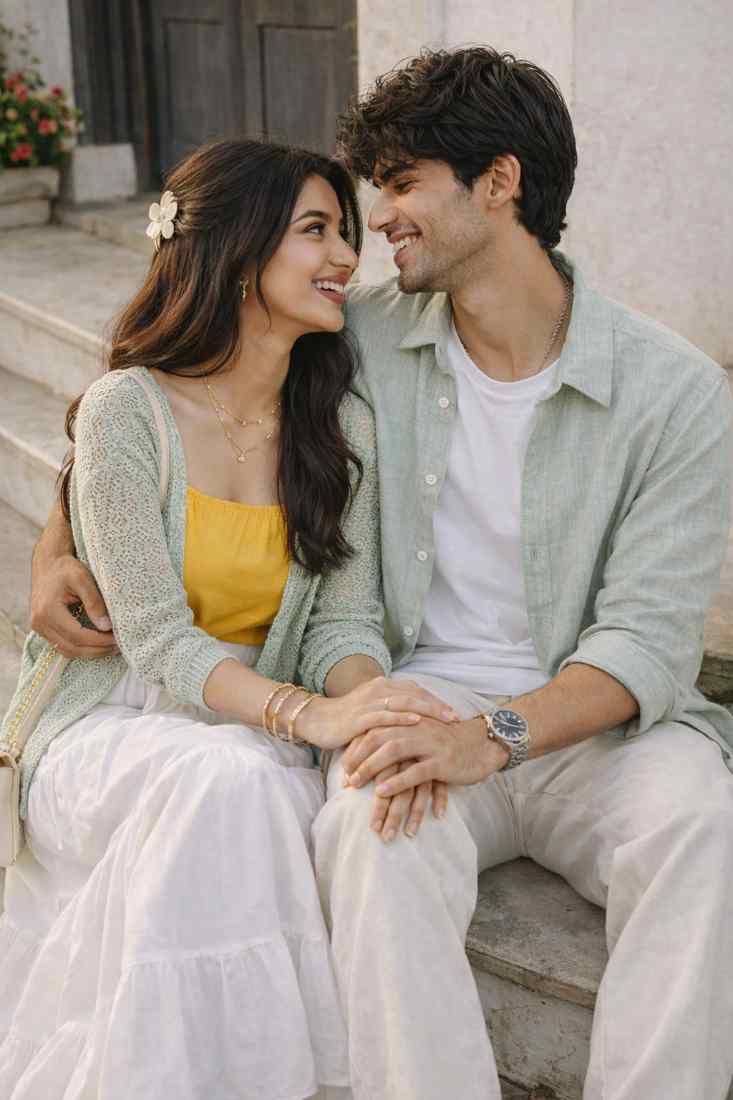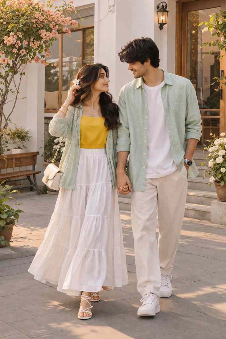This color-coordinated couple outfit blends warm mango yellow with cool sage green tones, creating a soft, fresh, and minimal vibe perfect for casual dates or vacation days.