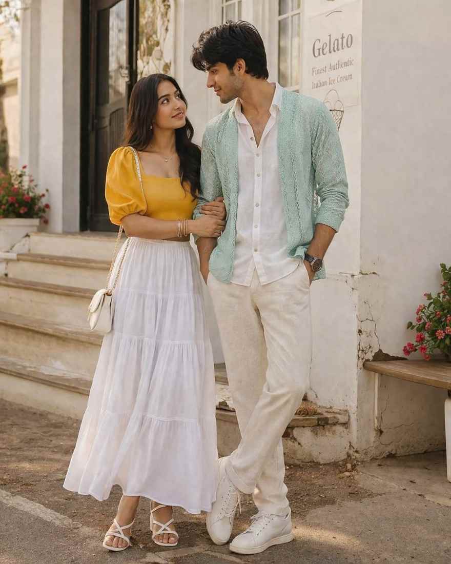 The warm mango yellow top provides a vibrant pop of color that is balanced by the calming sage green shrug and clean white skirt. For him, the sage green shirt mirrors her shrug, creating a cohesive but not "identical" look. The beige trousers and white sneakers ground the outfit, keeping it sophisticated yet relaxed for a summer date.