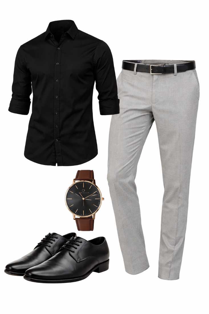 A fresh and elegant men’s summer outfit featuring a light blue linen shirt paired with off-white tailored trousers. Styled with tan leather loafers, a matching belt, and a minimal brown strap watch, this look delivers a clean, premium aesthetic. Perfect for summer outings, brunch, vacations, or smart casual occasions.